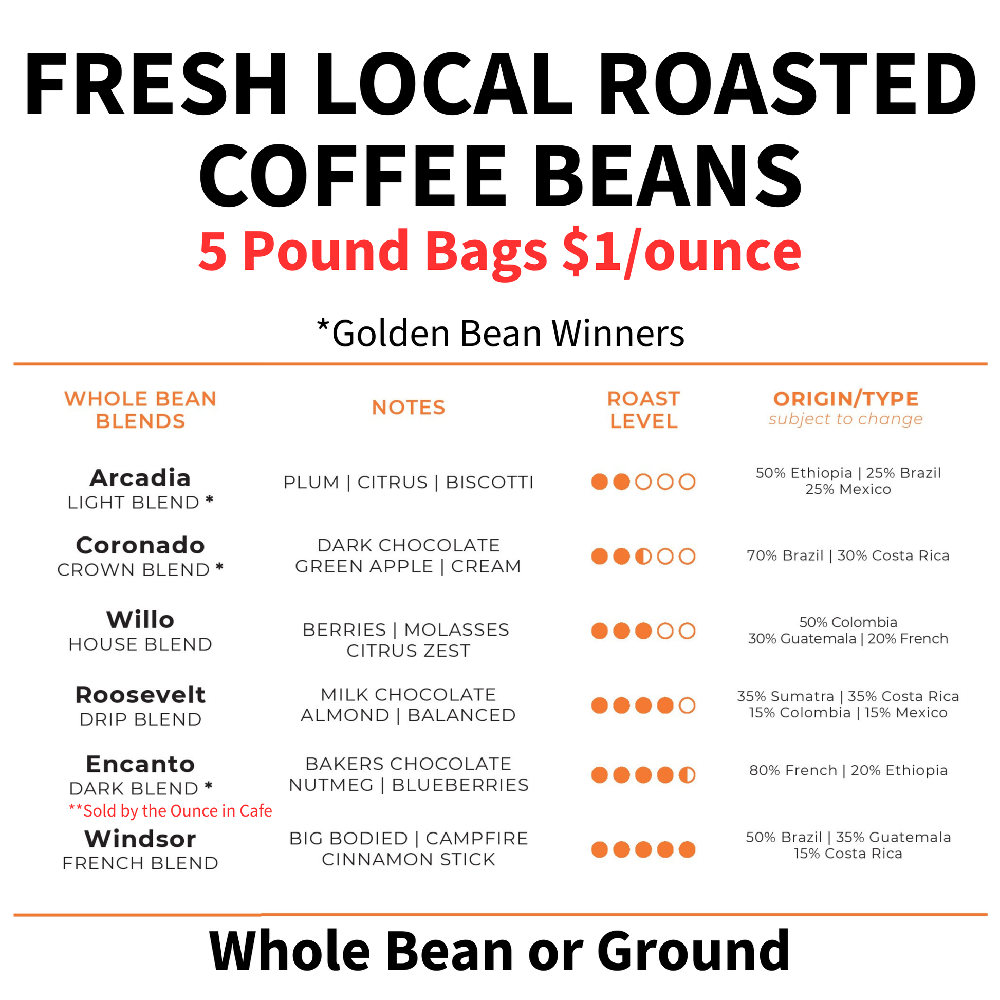 Fresh Roasted Coffee (Golden Bean Award Winner) 5# Bags/80oz $1/ounce